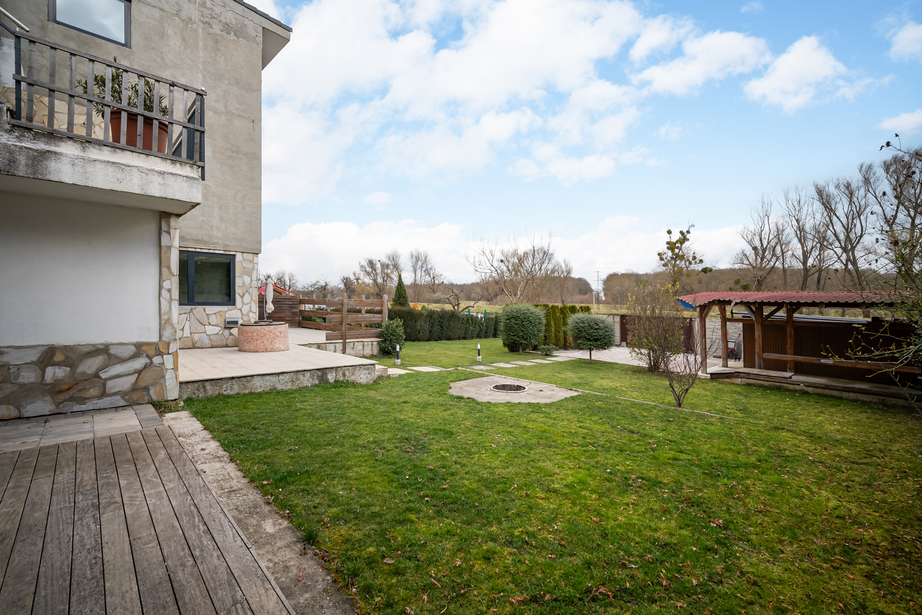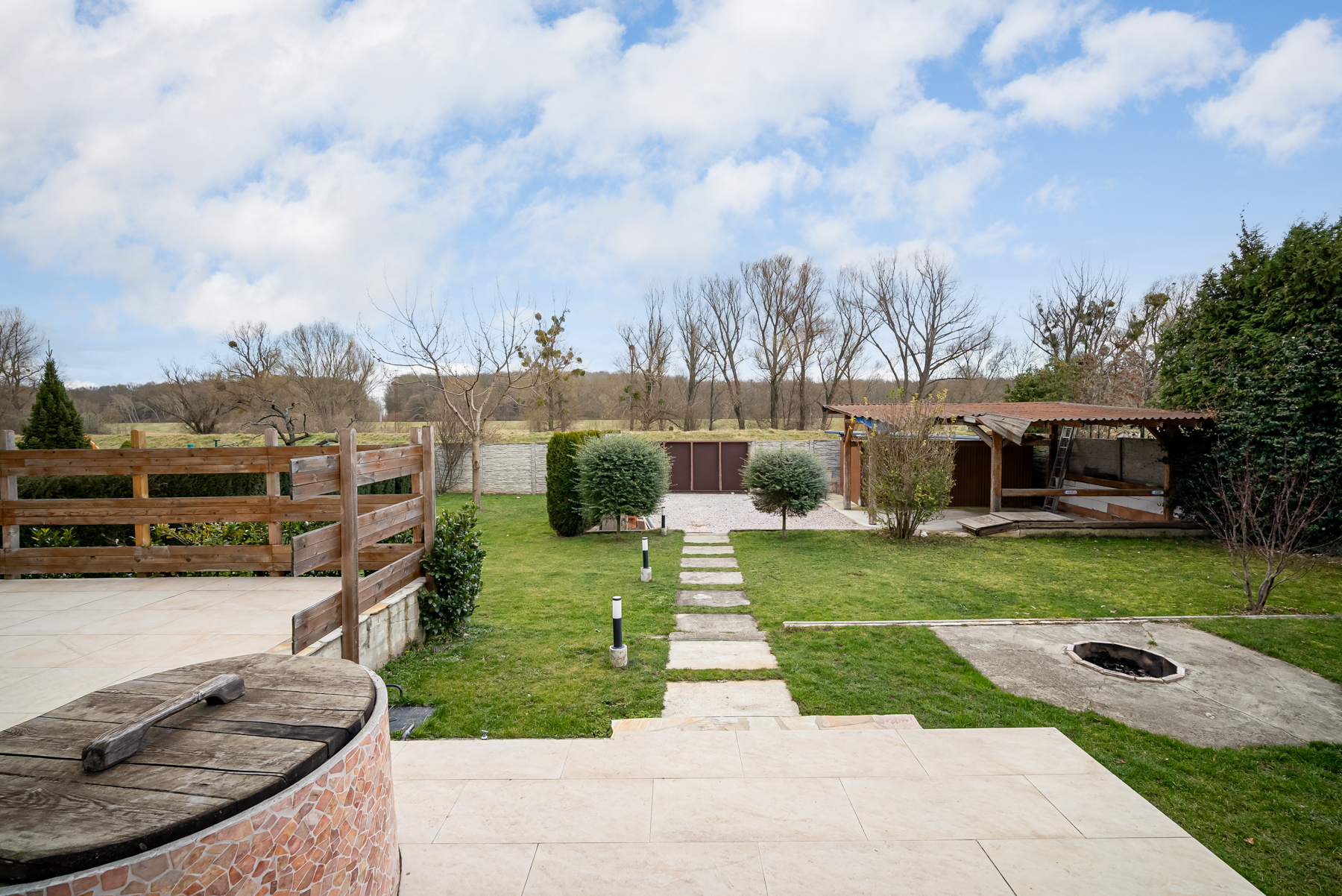 Velkorysá zahrada s výhledem do volné přírody – louky, lesy, ticho a soukromí. Možnost relaxace i rodinného zázemí. Automatické zavlažování, vlastní studna, kompletně oploceno. Prostor na vybudování letní zahrady a bazénu s relaxační zónou