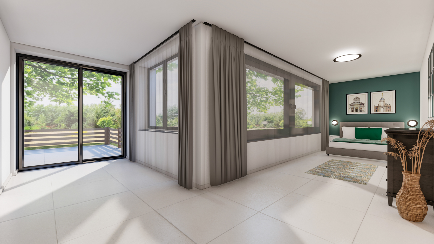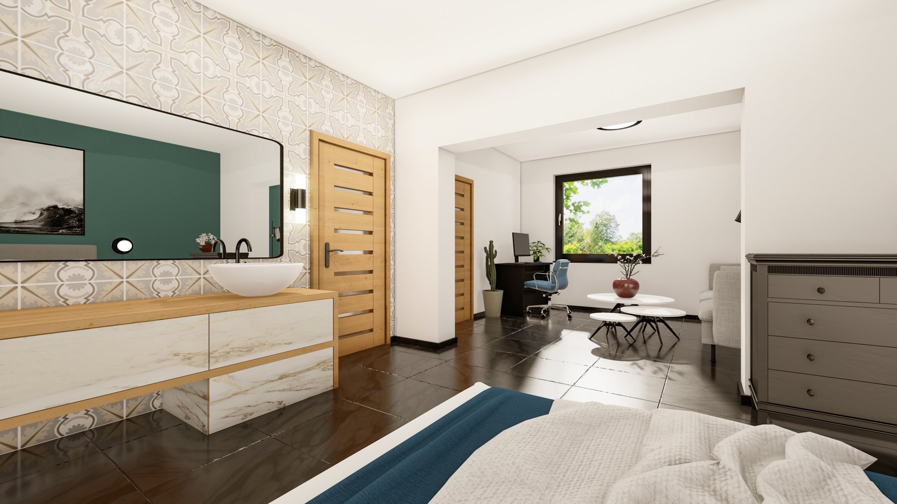Samostatný vstup , terasa s výhledem na okolní přírodu. Otevřený prostor s kuchyní, jídelnou, obývacím a pracovním koutem, ložnice vkusně a prakticky spojena koupelnou disponující vanou a sprchovým koutem, samostatné WC se sprchou.