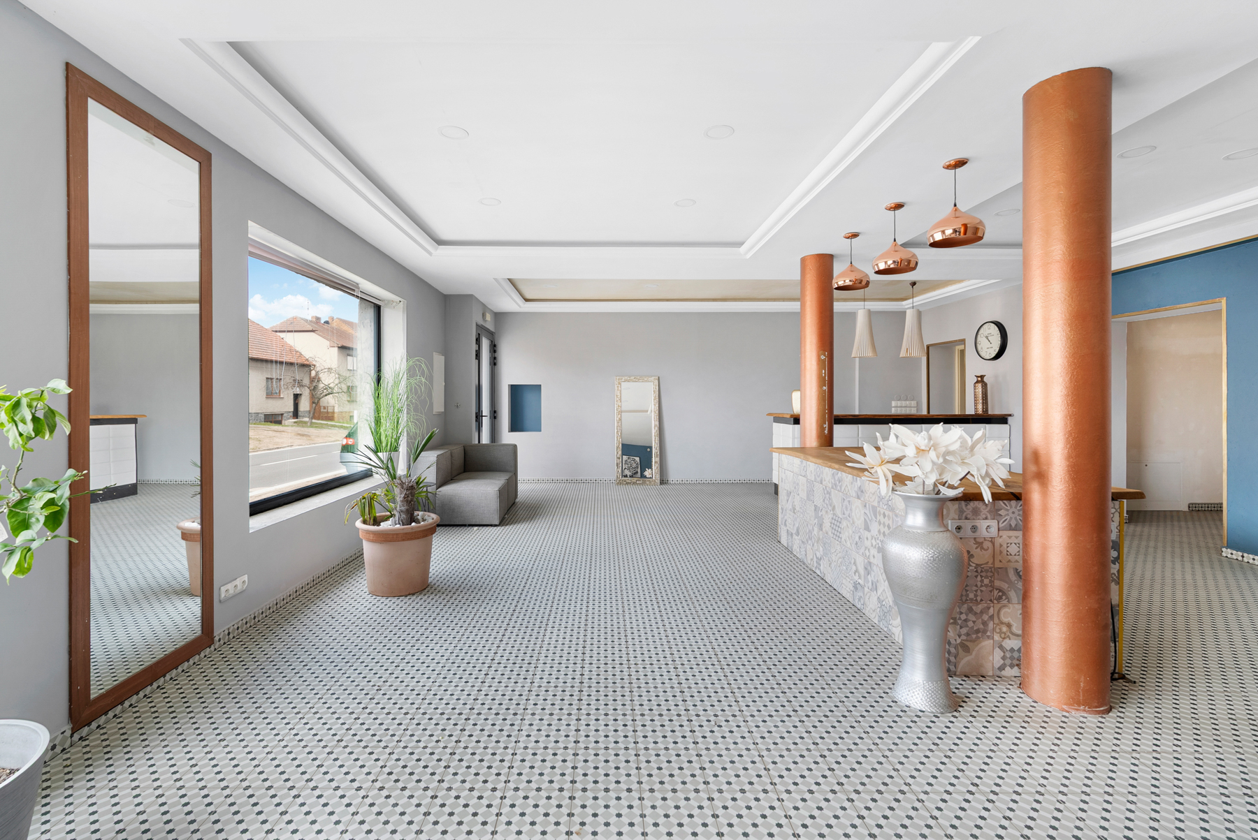 Kompletně zrekonstruované podlaží připravené pro provoz kadeřnických a kosmetických služeb. Prosklená celá část místnosti směrem do ulice-ideální pro výlohy, vestavěná recepce uprostřed místnosti a barový kout s odkládací místností, dvě samostatné místnosti, kuchyň s personální místností, dvě toalety, z hlavní místnosti schodiště vedoucí na 1NP