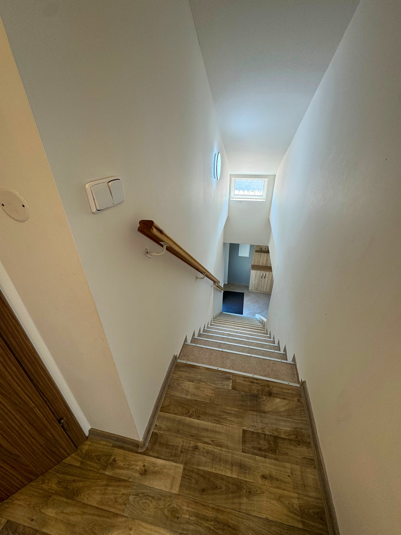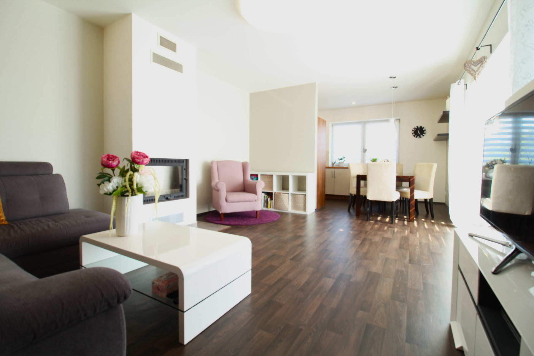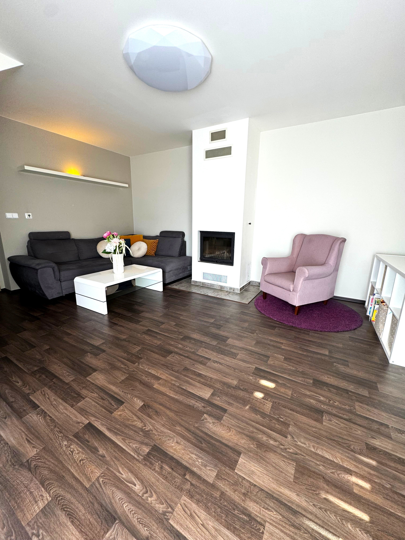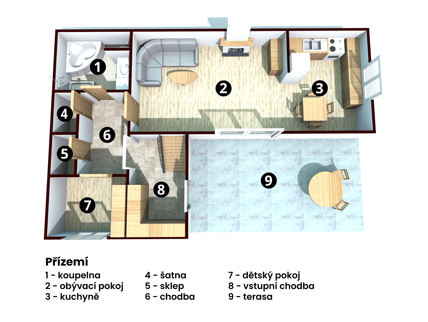 – prostorný obývací pokoj spojený s kuchyní a jídelním koutem, v obývacím pokoji je vestavěný krb, kterým je možné zajistit vytápění spodního patra domu