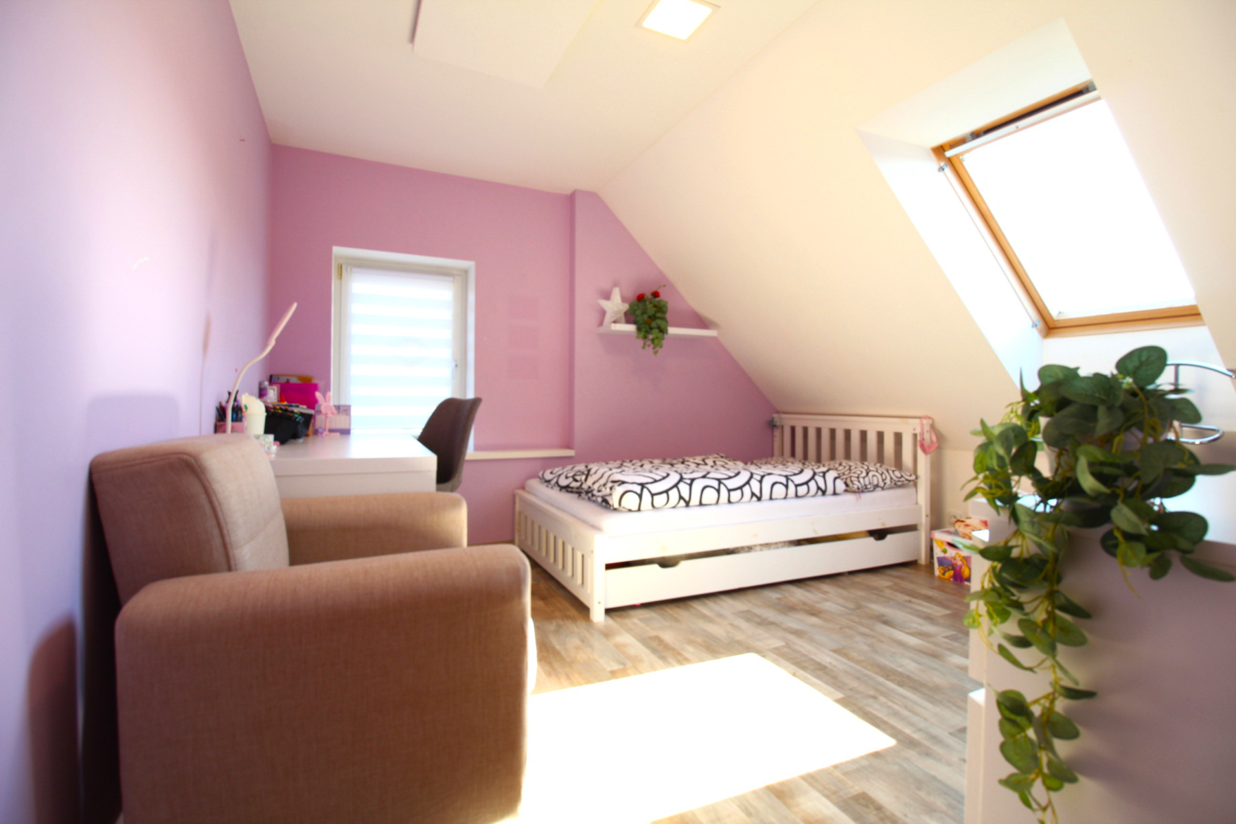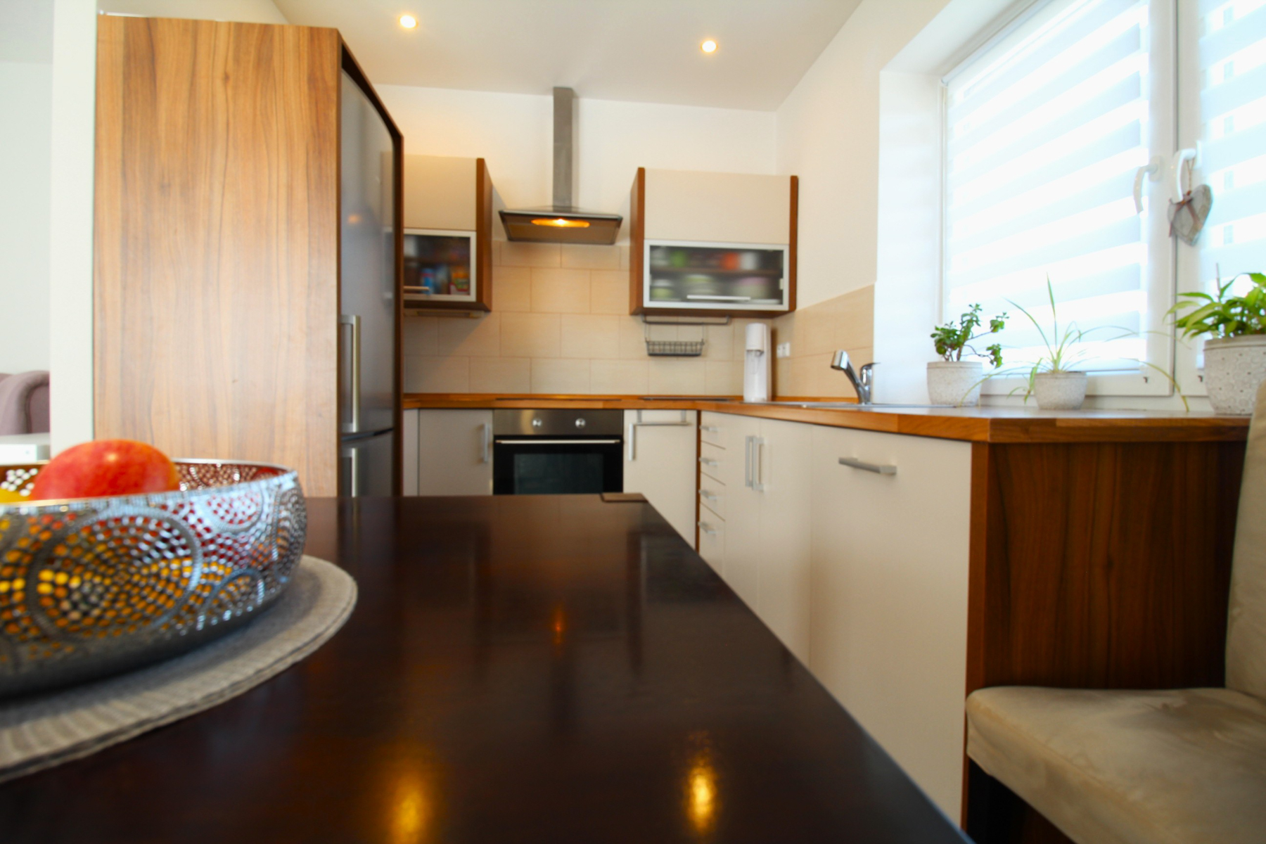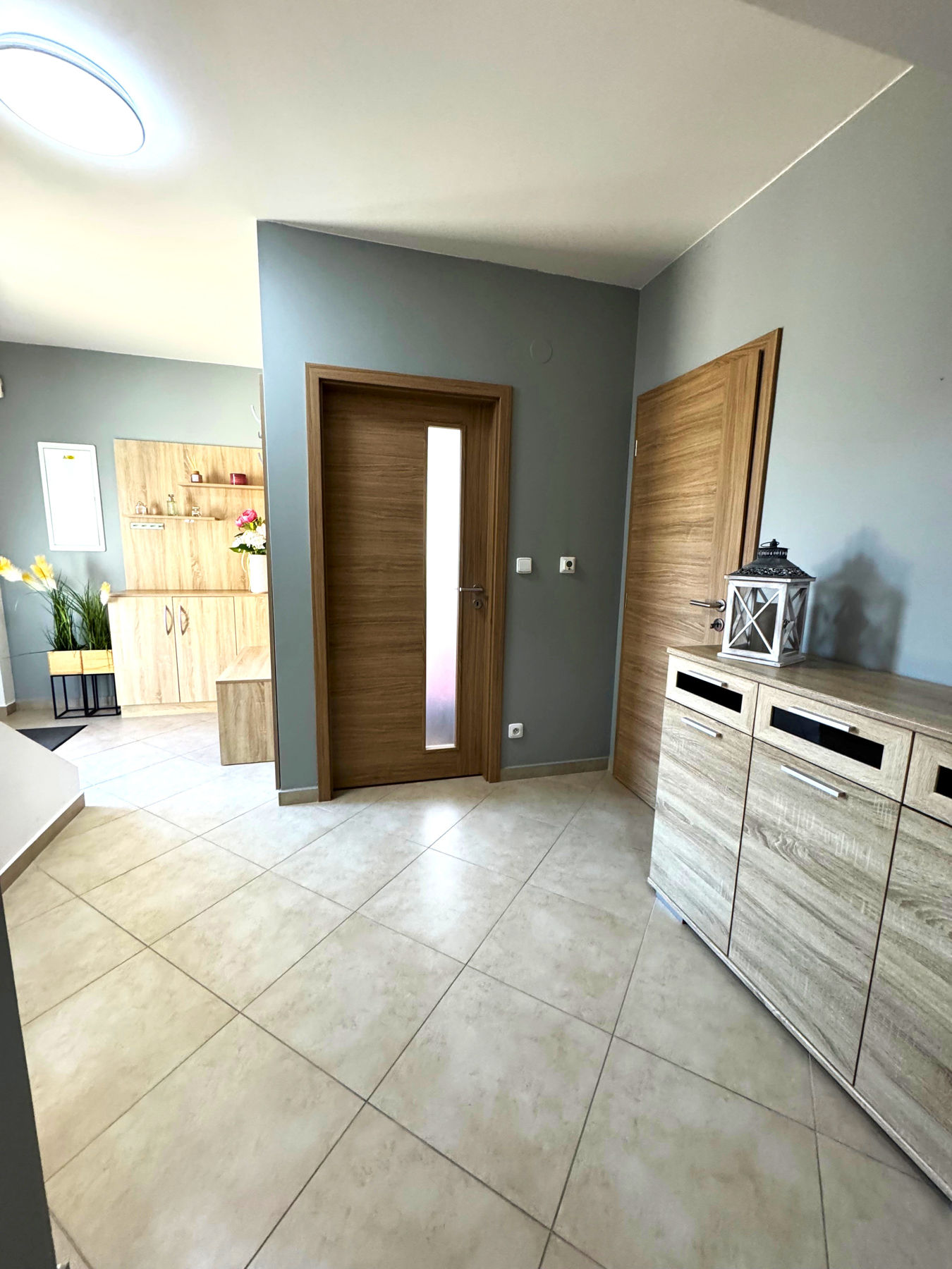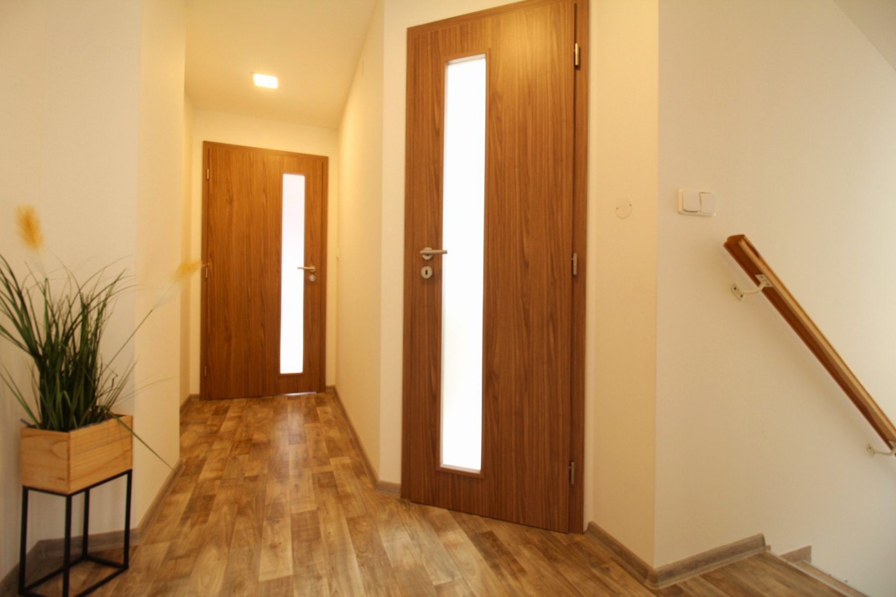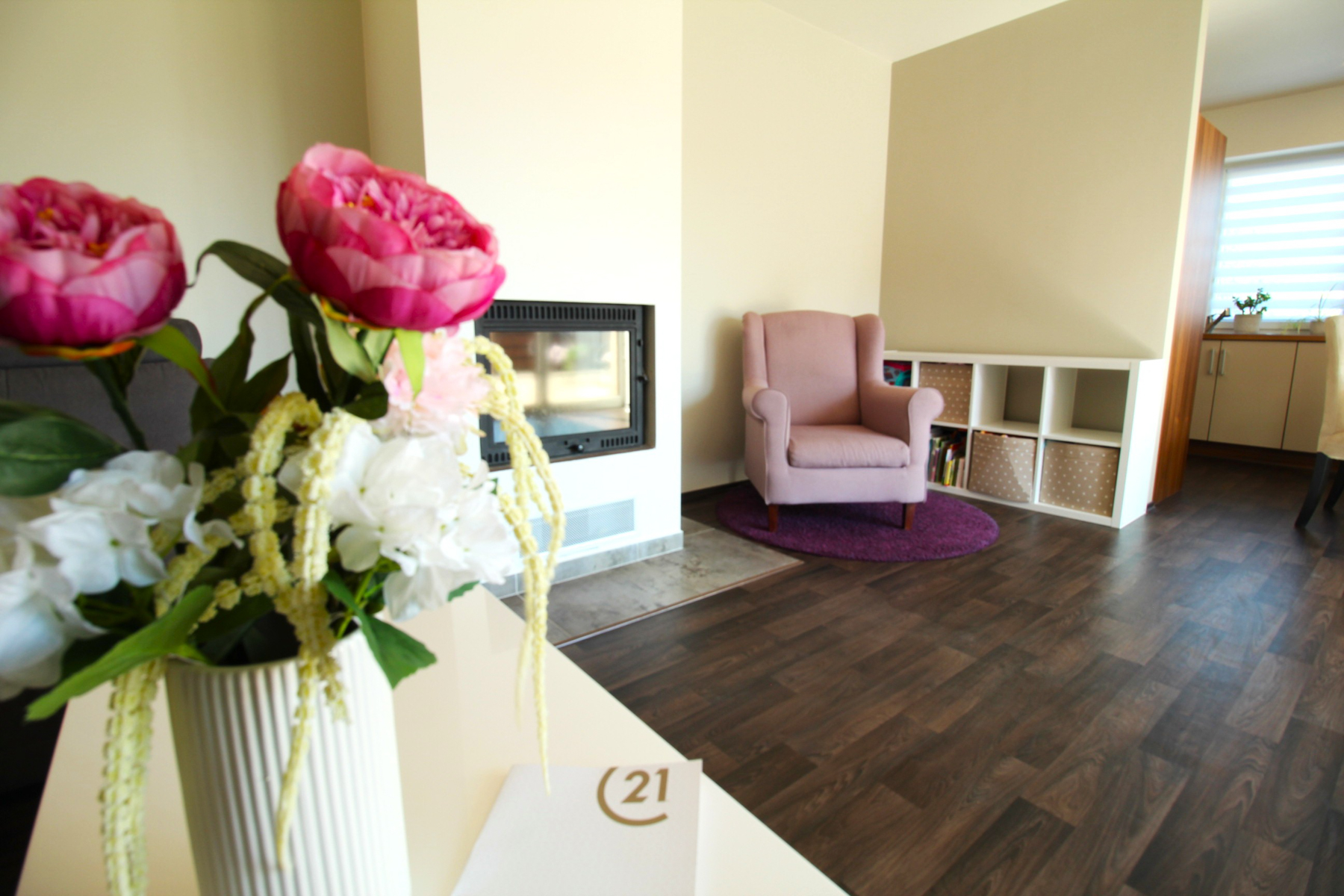 – prostorný obývací pokoj spojený s kuchyní a jídelním koutem, v obývacím pokoji je vestavěný krb, kterým je možné zajistit vytápění spodního patra domu