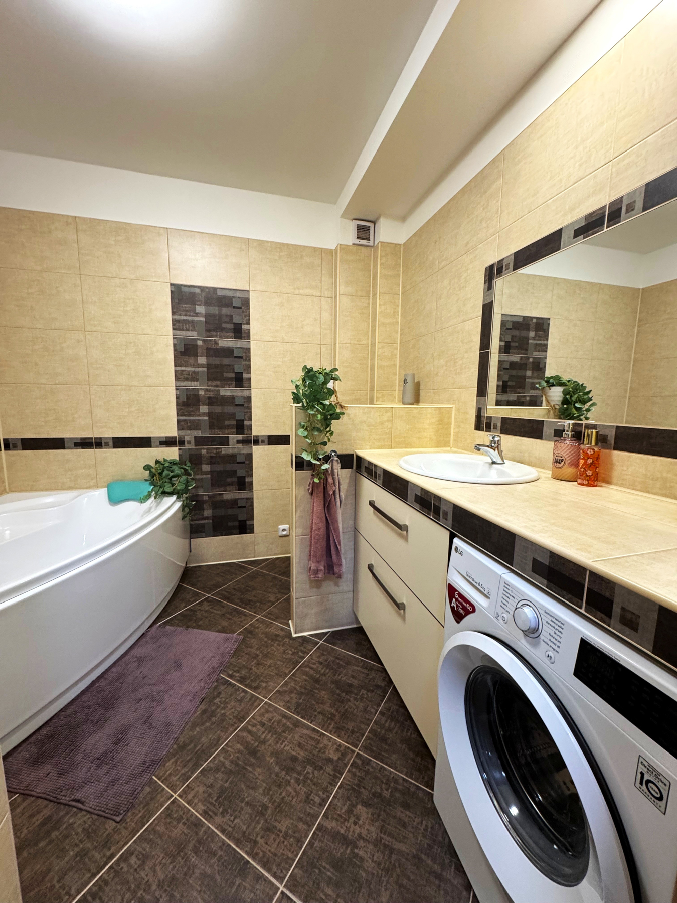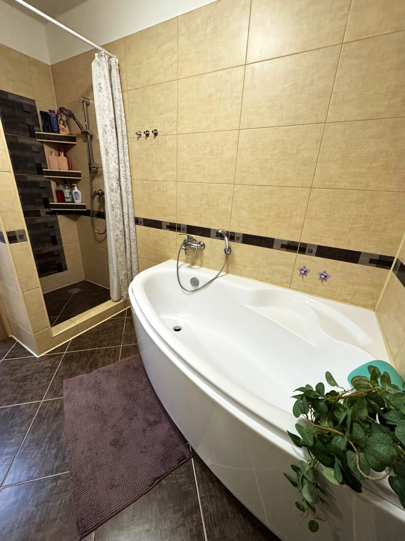 -prostorná koupelna s rohovou vanou, sprchovým vestavěným koutek a WC