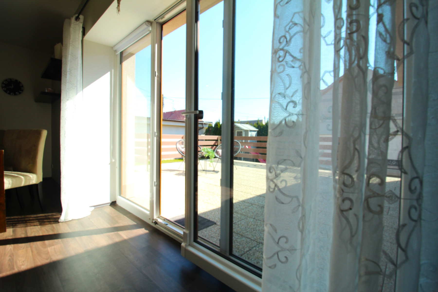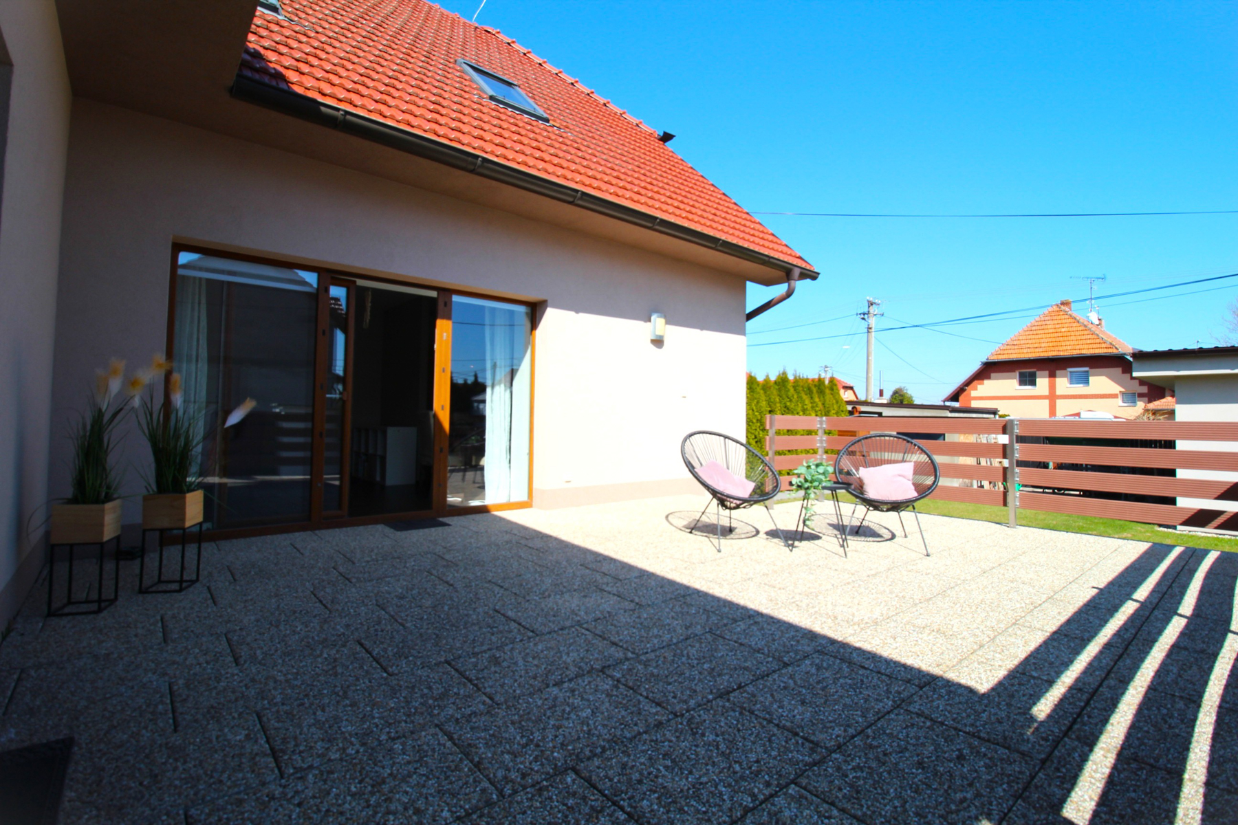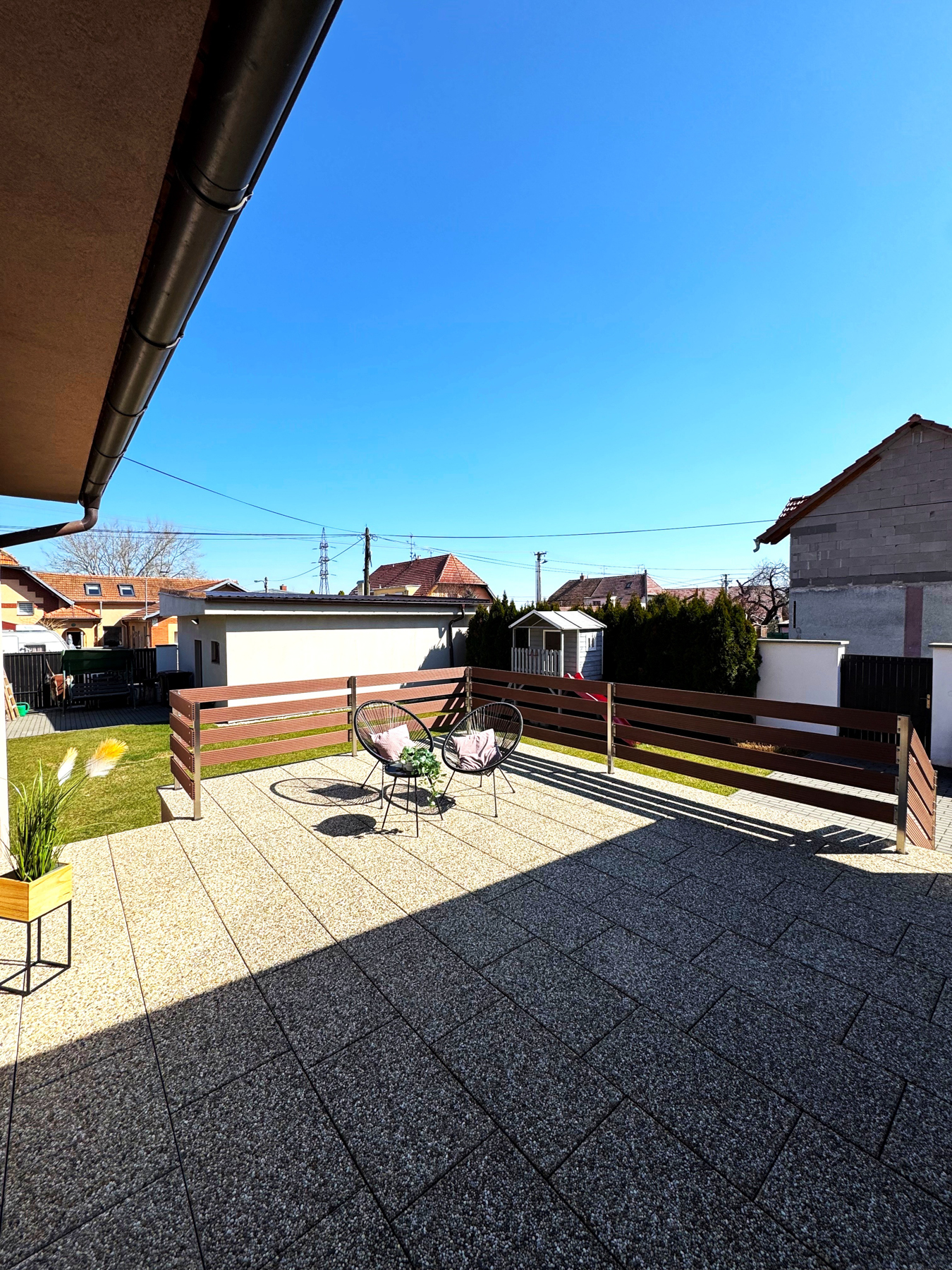 -z obývacího pokoje je vstup na velkou terasu, zde je možnost vybudování také zimní zahrady nebo dalšího pokoje, na terase je položena dlažba na terče, není lepená
